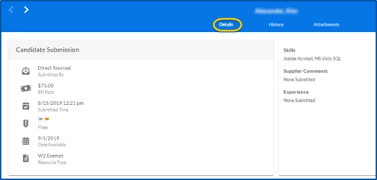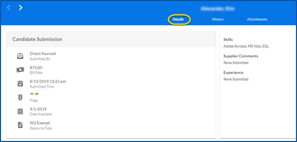 - Review specifics about the candidate submission, such as who submitted the candidate, his or her bill rate, and more from the Details tab.