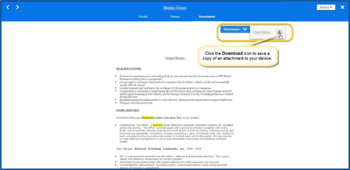 TIP: Key words in a resume matching the job title and/or job description are highlighted in the Attachments tab. - Optional: To download a copy of an attachment to your device, expand the Attachments list, and click the Download icon.