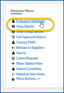 - From the Evaluate Candidates link on the Request Tabbed View.