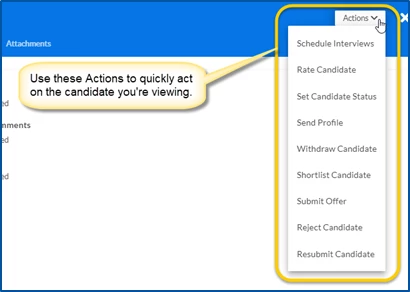 - If you want to act on the candidate you’re viewing, expand the Actions list in the upper right corner of the Candidate dialog. Then select the action you want to take.