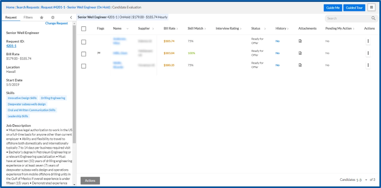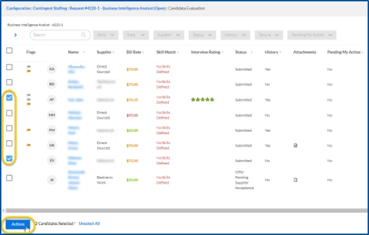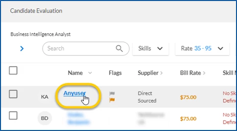 - Centralizes necessary candidate data (such as bill rate, skills match, tenure, and more) in a single view to help you quickly evaluate and select the perfect qualified candidates.