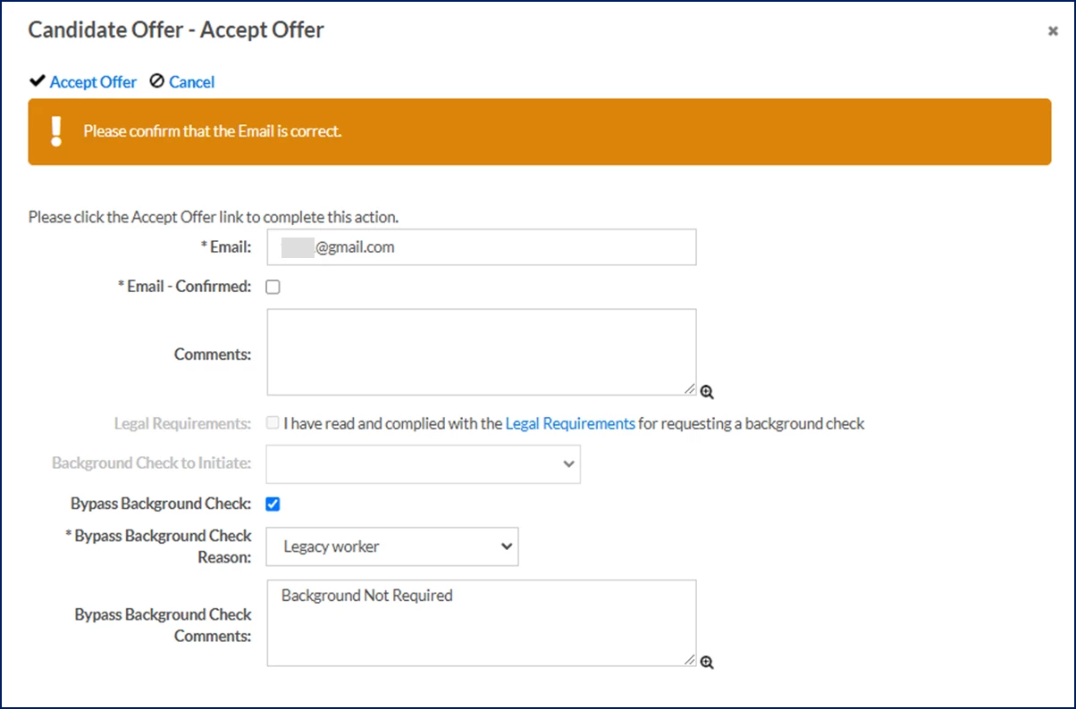 Select Accept Offer. A notification is sent to your program office to confirm that the candidate can progress through the onboarding workflow without a background check.
