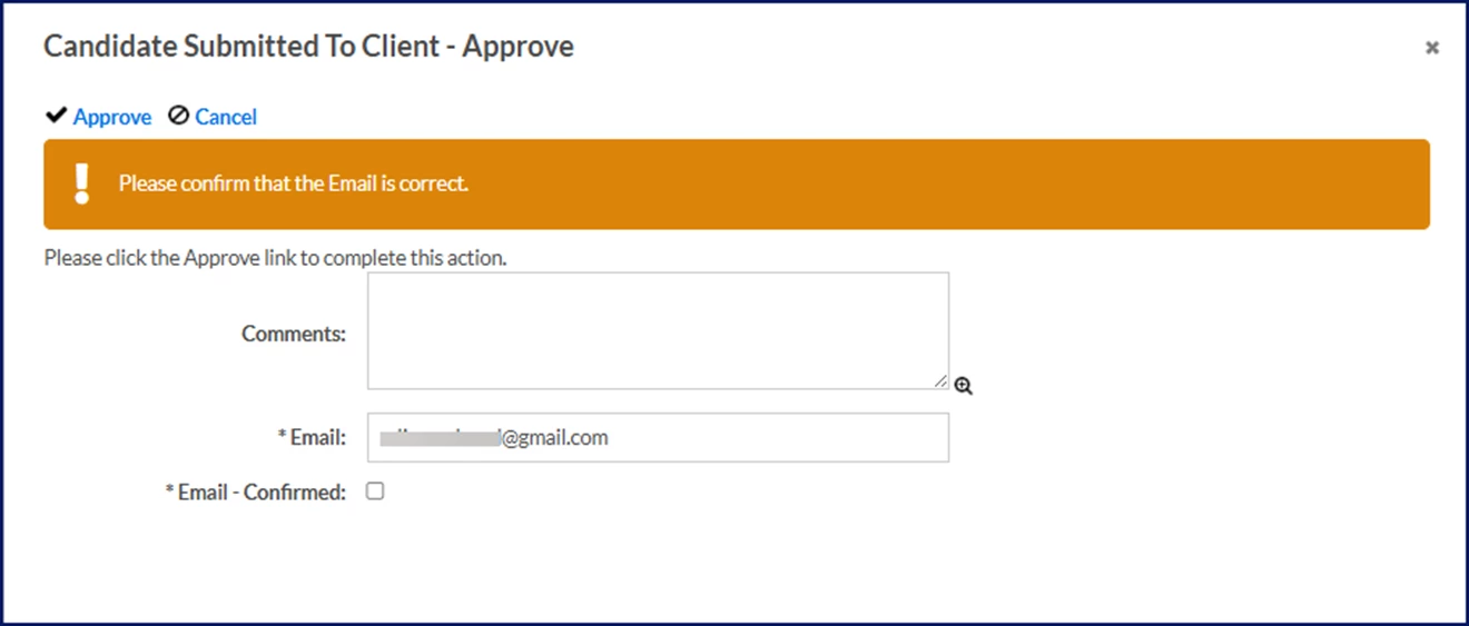 Select Approve. A Candidate Submitted to Client–Approve dialog displays.