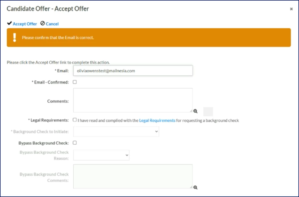 Select the Accept Offer. A Candidate Offer–Accept Offer dialog displays.