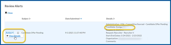 Select the Candidate Offer Pending tasks awaiting action link in the My To Do section of your dashboard. A Review Alerts dialog displays.