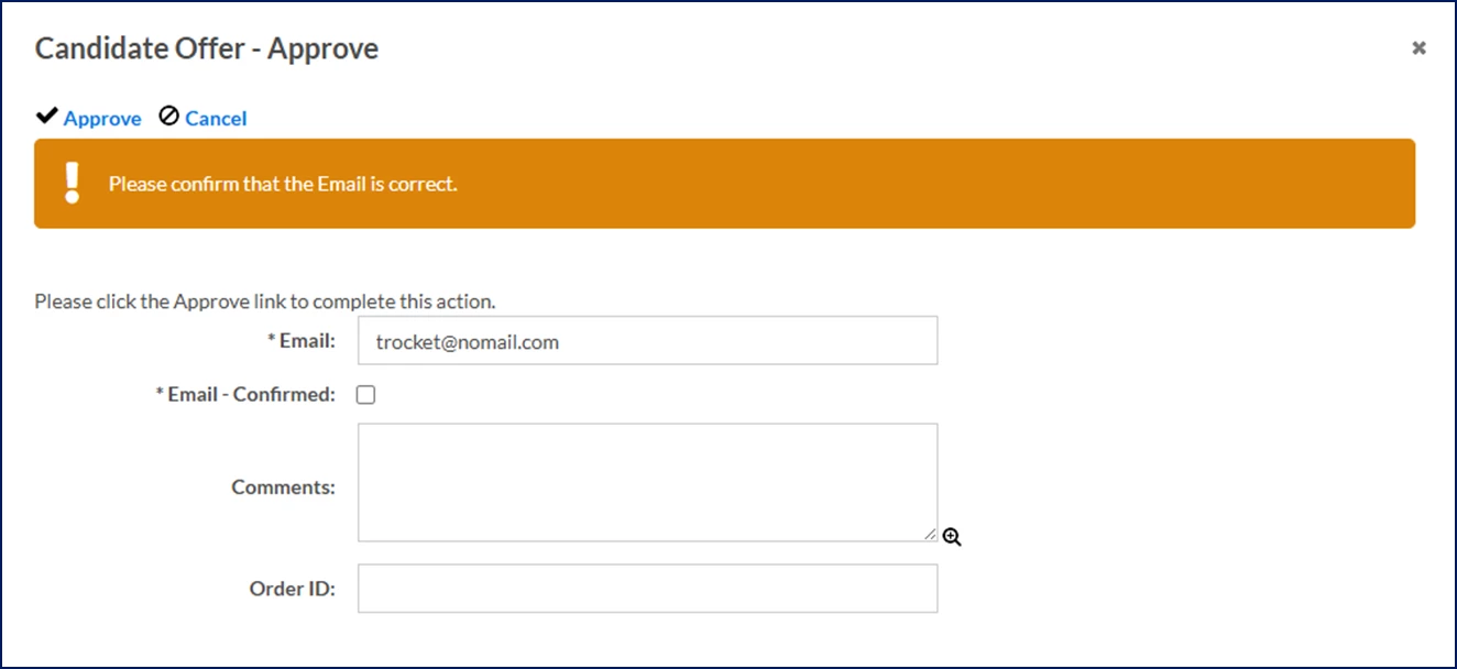 Select the Accept Offer. A Candidate Offer–Approve dialog displays.