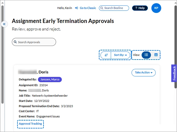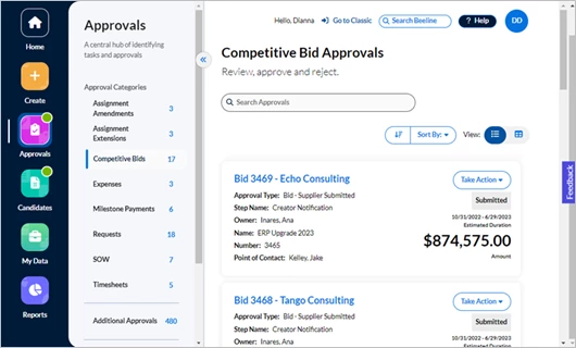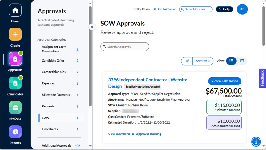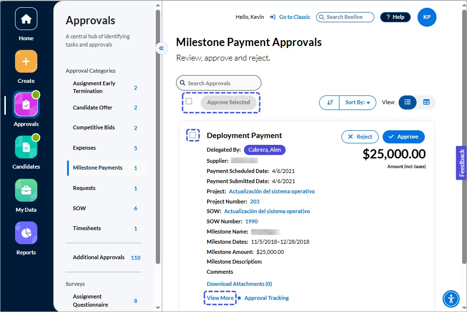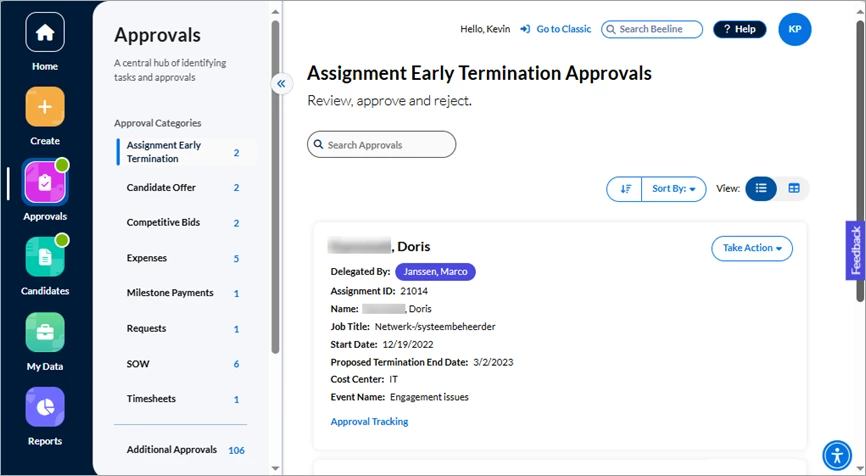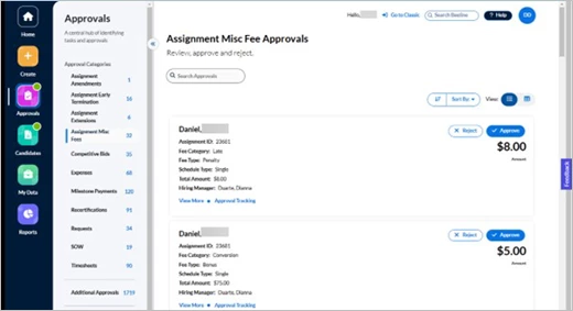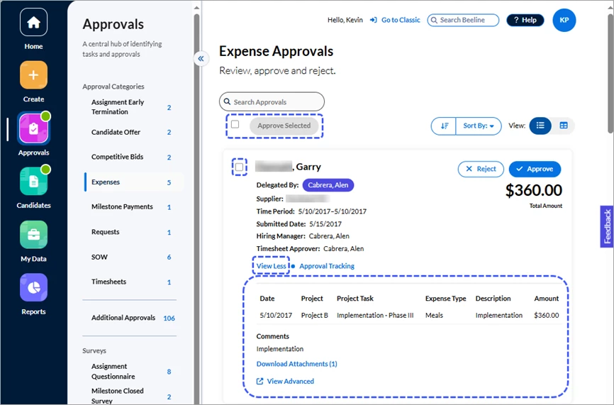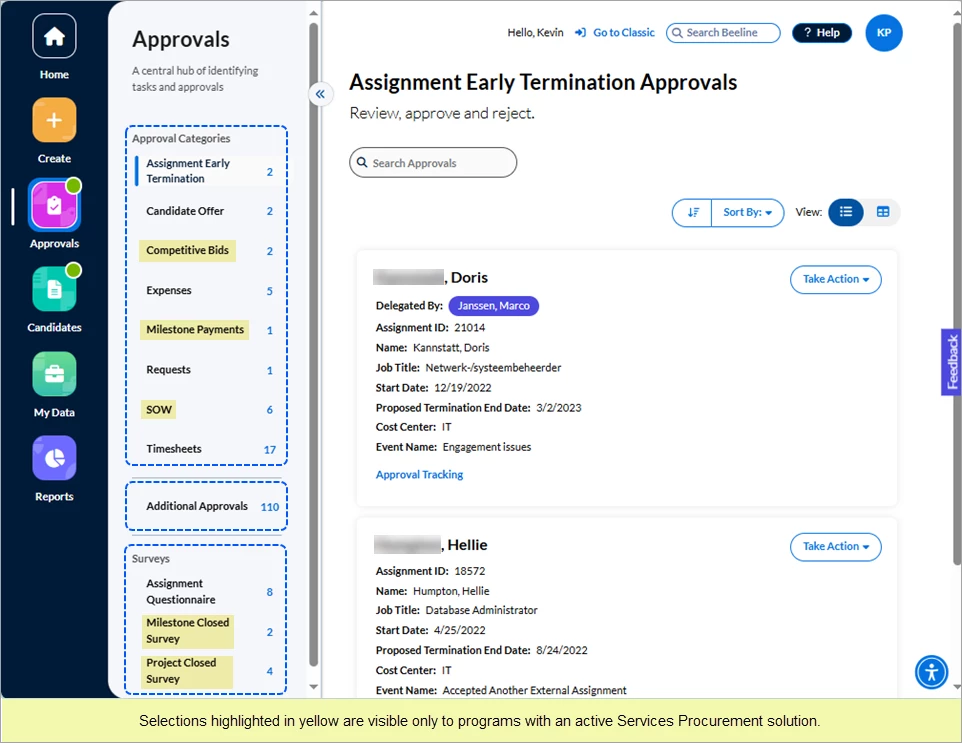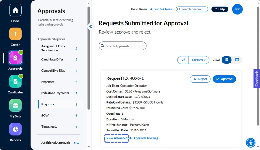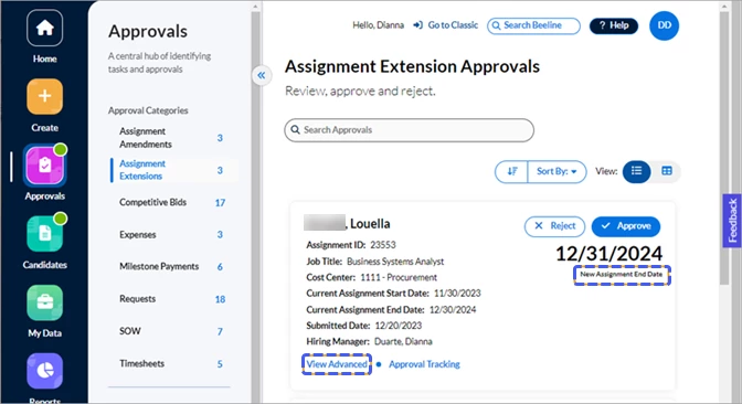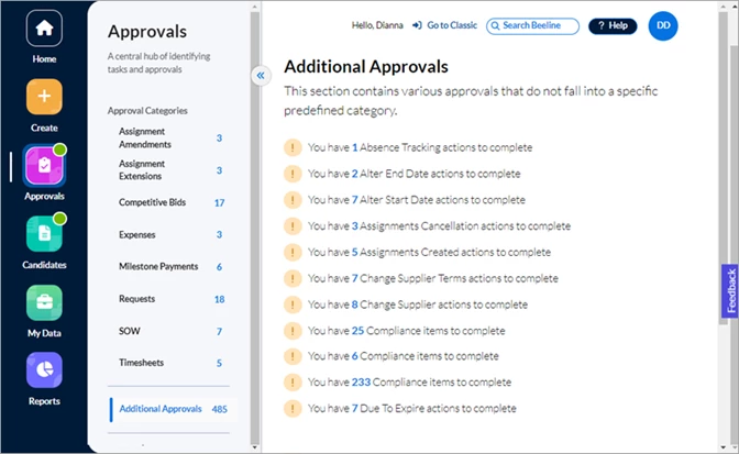 Click either the Approvals number in the Action Required section of the Home screen or the Approvals app button in the navigation panel. Your screen refreshes to display all approvals waiting for you to take action. The slide-out panel located between the navigation panel and your work area separates the approvals into sections by Approval Categories, Additional Approvals, and Surveys. What you see listed depends on which tasks are assigned to YOU within Beeline Enterprise. Request and Assignment related approvals are visible to both the Hiring Manager as well as the Hiring Manager’s manager, making these records visible and actionable by either manager.