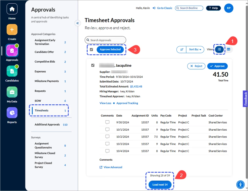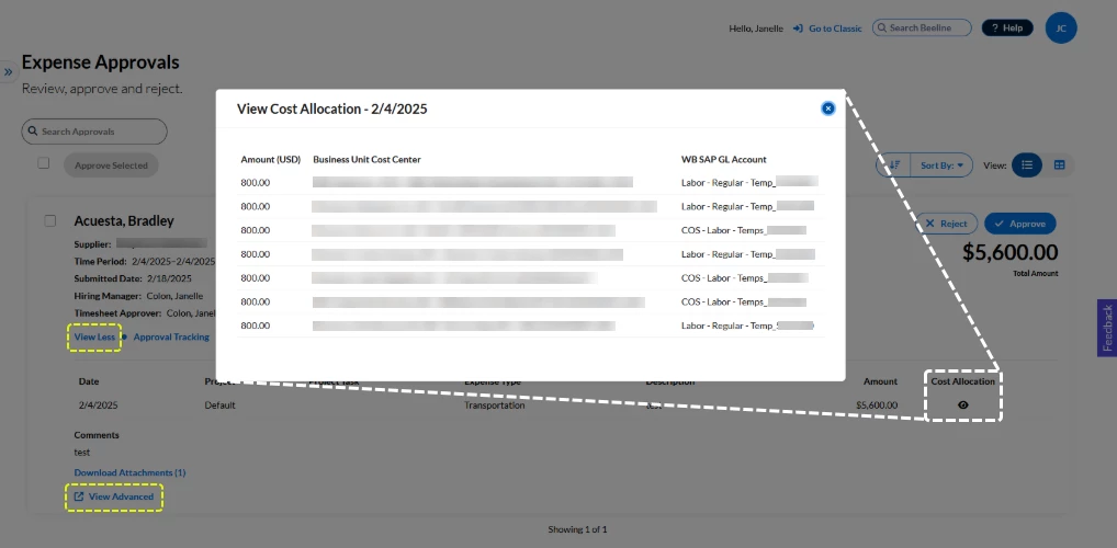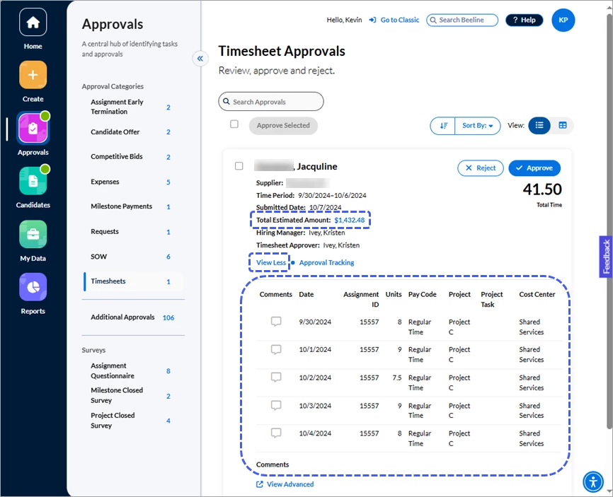 If your Beeline Enterprise instance includes Cost Allocations as part of its financial tracking, you can easily check this information on approval records for Timesheets, Expenses, Miscellaneous Fees, and Milestones. Follow the same process steps provided below to access information for all approval categories where cost allocation is a valid option.