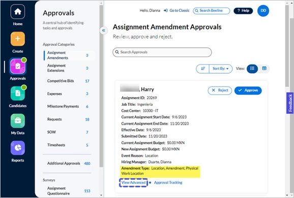 Not all assignment amendments require approvals. Approvals are needed for updates that impact the budget (for example, extensions, cancellations) or assignment management (for example, work location or equipment issued during onboarding). Be sure to check the Amendment Type field so you’ll know which information to check on the assignment record. To view the full assignment record, click the View Advanced link. The Reject action button opens a text box for you to explain why the amendment was rejected and what adjustments need to be made in order to resubmit.