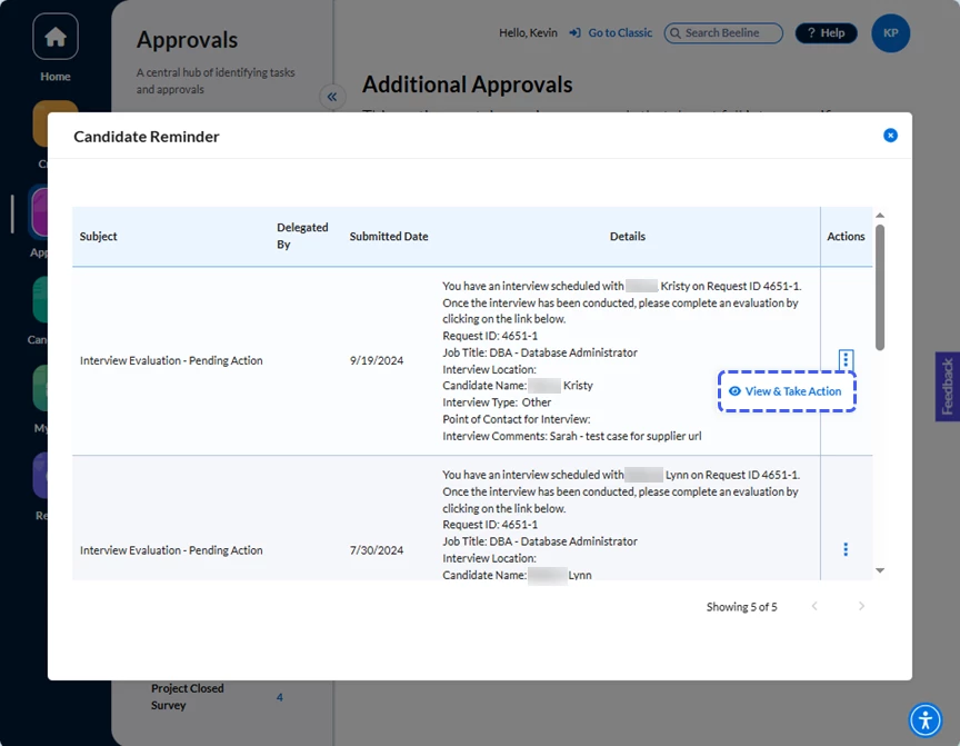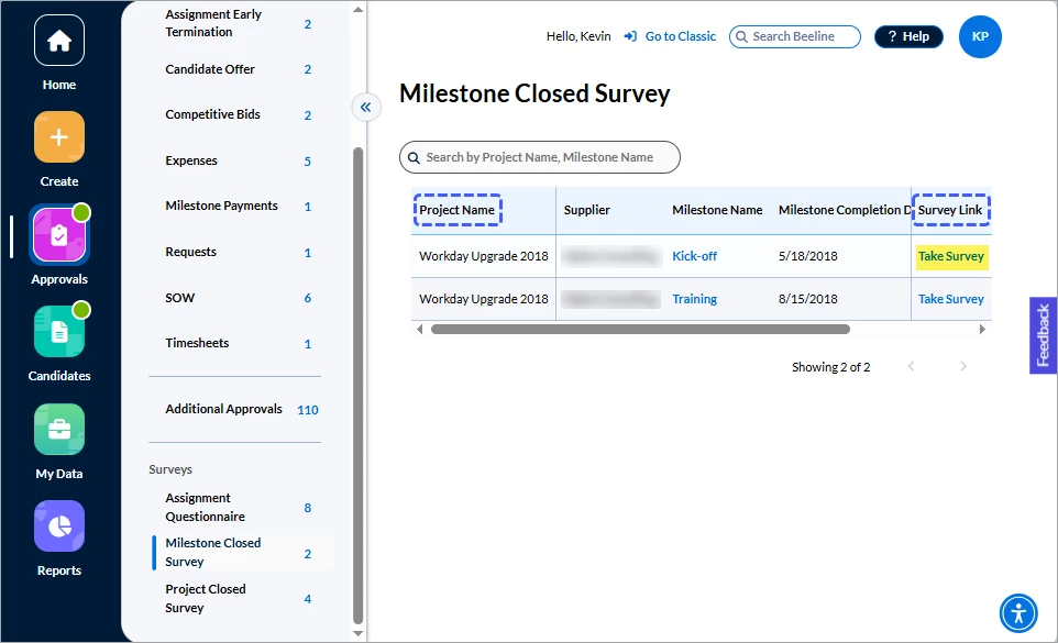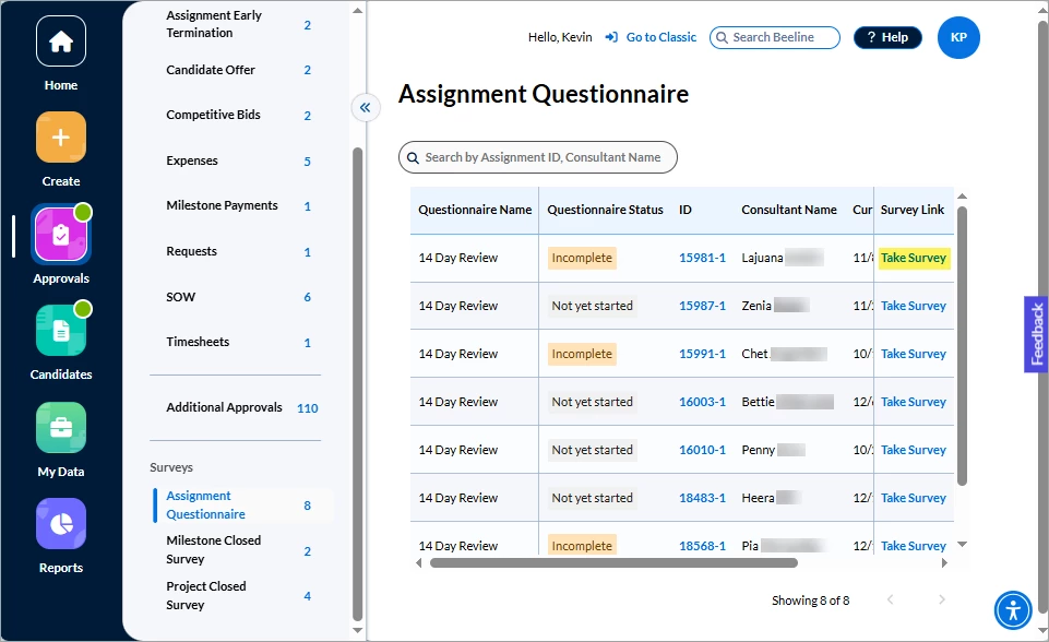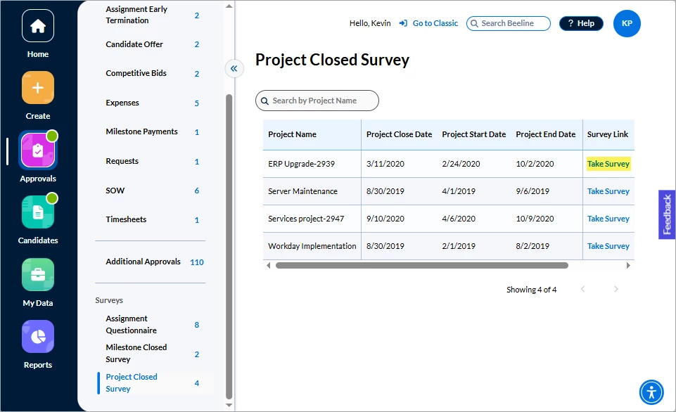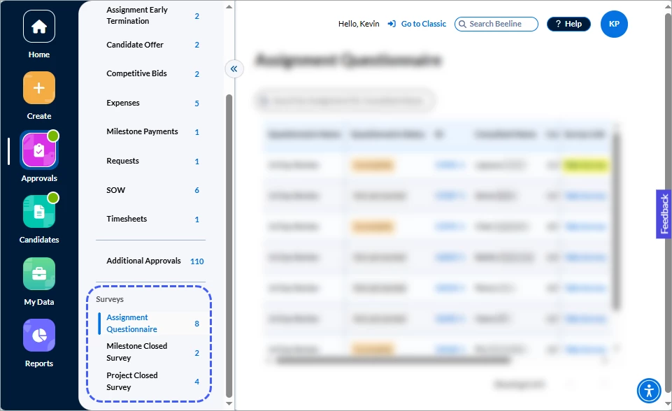 Programs decide which, if any, questionnaires and surveys to assign to Hiring Managers. In Classic Beeline, notifications informed Hiring Managers of these tasks. The Surveys section in the Approvals app now lists all outstanding questionnaires or surveys and includes a direct link for easy access. No more overlooked notifications causing you to miss providing this valuable feedback!
