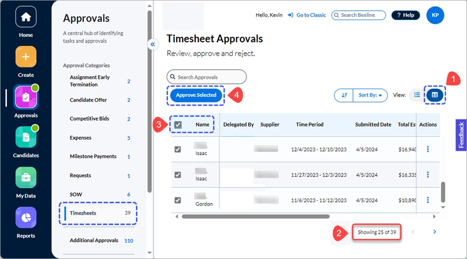 Approvals can be processed in bulk for Timesheets, Expenses, Recertifications, and Milestone Payments by batching these records together and then approving them as a distinct group. Each Card View screen can display up to 25 records. You can combine ALL records together into a combined group by clicking through the screens until you reach the end of the list. Then scroll to the top of your combined list and click the checkbox next to Approve Selected. This activates the Approve Selected button. (It will turn blue.) Click Approve Selected and ALL the records will be approved as a distinct group.
