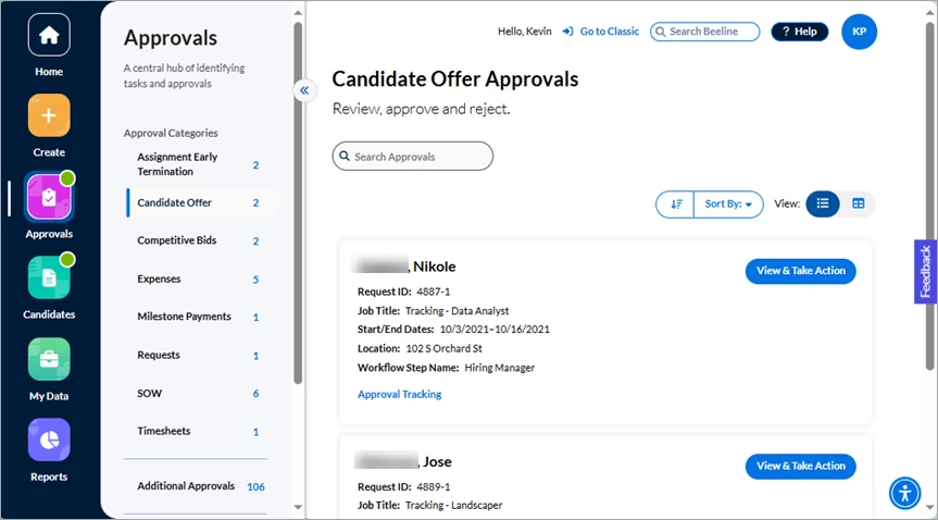 The Candidate Offer marks the end of the candidate review process when the successful candidate is identified and the Program Office works with Supplier to finalize the details of the offer. The Hiring Manager approves prior to onboarding. Separating Candidate Offers into their own section of the Approvals app makes it easy for Hiring Managers to search, sort, and track all Offer approvals. Approval step information is readily available by clicking the View & Take Action button.