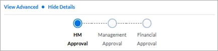 In Card View, records display in order of the Sort By filter setting. Fields display in a single column aligned along the left hand side. Buttons and features are located in the same area of the screen throughout the categories although the functionality may vary slightly. Take care to notice the differences in summary data fields and the differences in Sort By options. All card views include an Approval Tracking link that displays an approval process graph (see sample below) to let you know which approval steps have been completed, as well as which steps still need to be completed. They also include either a View Advanced or View More link to access additional details related to the approval record.