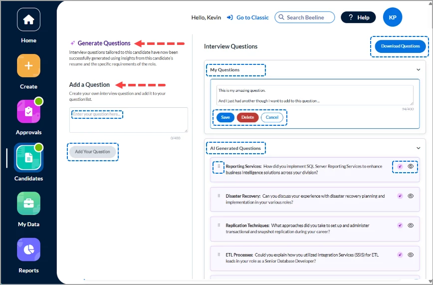 Our objective is to enhance and facilitate the overall process, so this functionality also includes a section where the hiring manager can create and incorporate their own questions (My Questions) into the interview process.