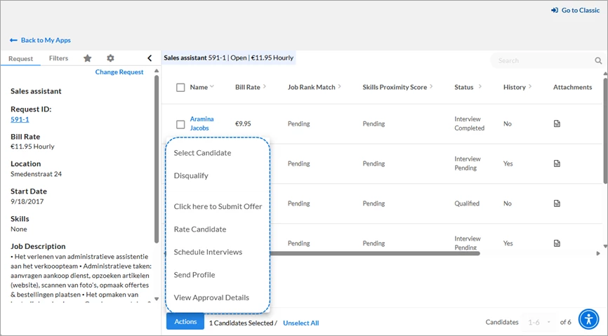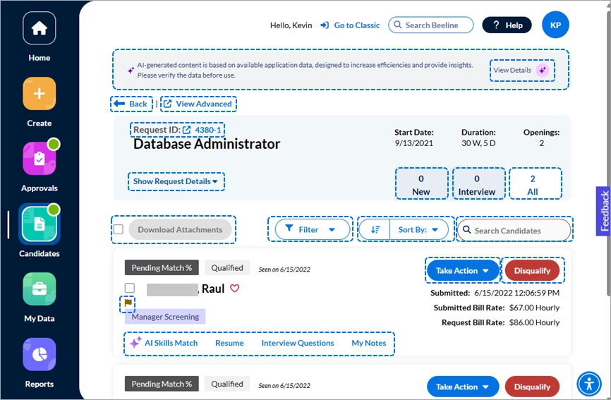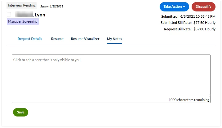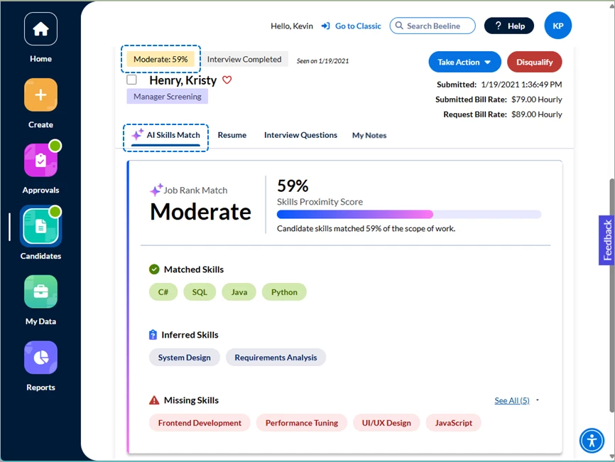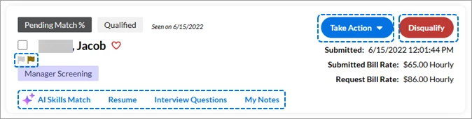 - Easily verify the candidate’s submitted date, submitted Bill Rate, and Request Bill Rate by viewing the information posted beneath the Take Action button.