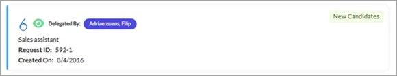 Each Request is shown as a separate card. The details inside the card include Job title, Request ID, and the Created On date. If the Request is one that was delegated to you, the Delegator’s name will display to the right of the number of submitted candidates. A New Candidates tag displays on the right side of the card to indicate that candidates have been added to the open Request.