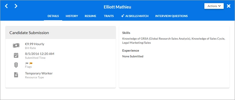 Click the candidate’s hyperlinked name on the left to open the Candidate Details modal window. This modal window gives you easy access to the candidate’s details, history, attachments (for example, resume), traits, and Actions options. Access is available all from a single pop-up window without the need to open additional tabs or windows to research or take actions on the candidate. You can use the forward and reverse arrows to switch to any other candidate in the list. Click X in the upper right corner to close the modal window and return to the Candidates Evaluation screen.
