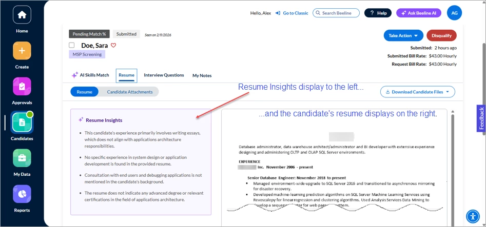 To view the candidate’s full resume, just click the Resume tab. The submitted resume displays on the right side of the screen and the AI-generated Resume Insights display on the left side as four bullet points. These bullet points are designed to provide insights as to the candidates: