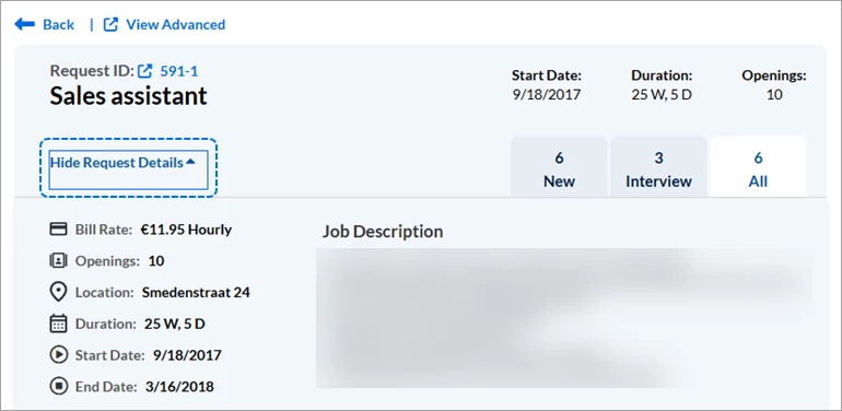 - Click Show Request Details (located below the job title on the Candidate Details screen) to expand the summary view to the expanded view for additional Request details. Start Date, Duration, and Openings are repeated while Bill Rate, Location, End Date, and the Job Description are only visible in the expanded view.