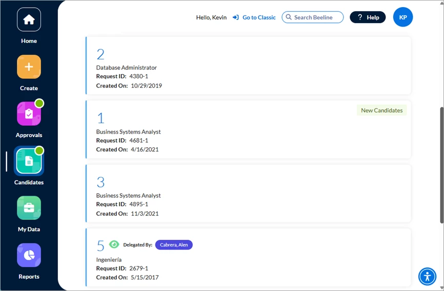 The process begins when you click the Candidates app button in the navigation panel and the platform “fetches” all candidates submitted for your review based on your open Requests, or those delegated to you. Then, just sit back and let the “digital assistants” do their job!