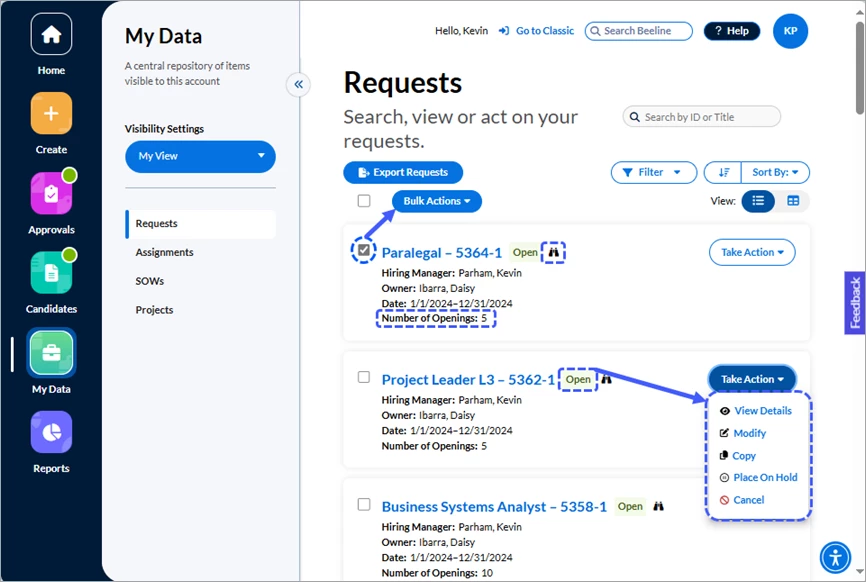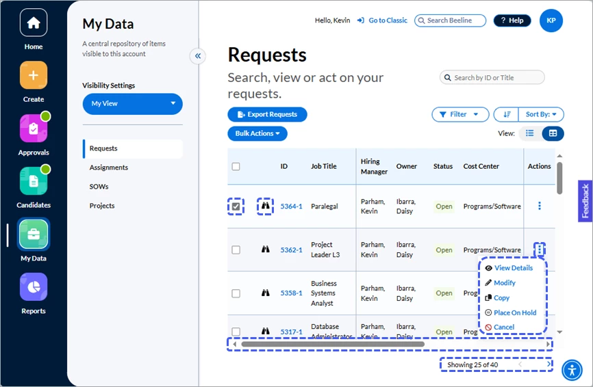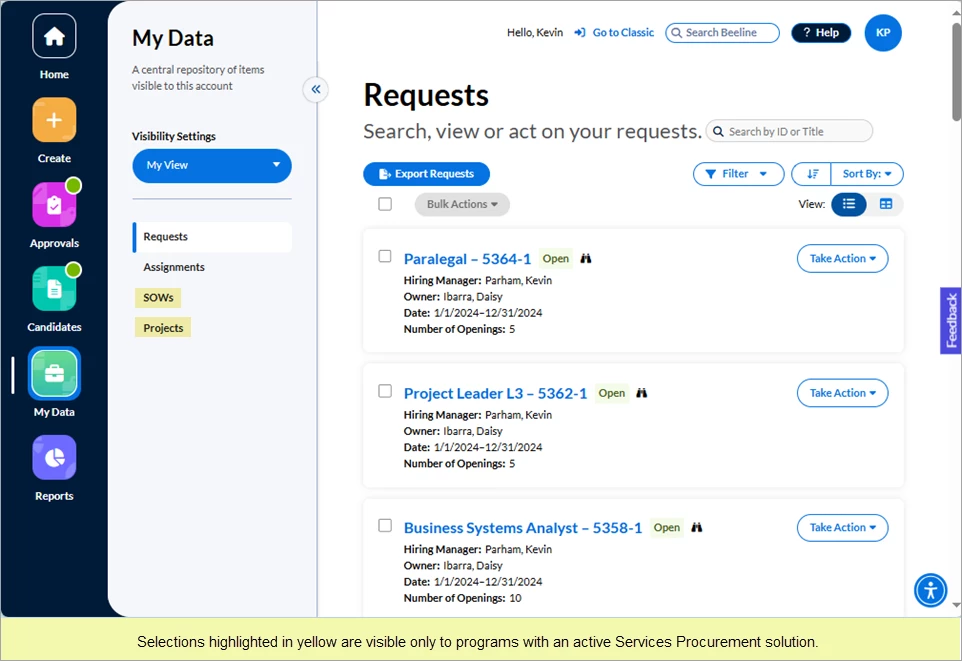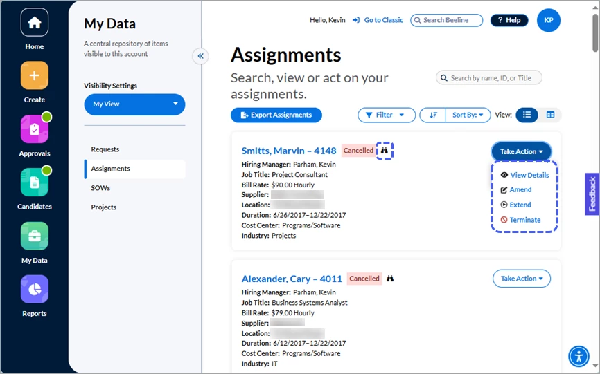 Depending on the scope of your Beeline Enterprise instance, you could be a Hiring Manager, a Hiring Manager’s Manager, an SOW owner, or a Project Manager. And then there’s all those workflow-related tasks such as requestor, approver, timesheet approver, sponsor, or contributor—or just being the one responsible for system data when it isn’t even associated with an active task. Simplify all this oversight responsibility by using the filter options and the Setup delegate hyperlink located in the Visibility Settings section (left-side slide-out panel) of your My Data app to choose the data you want to view and focus on.
