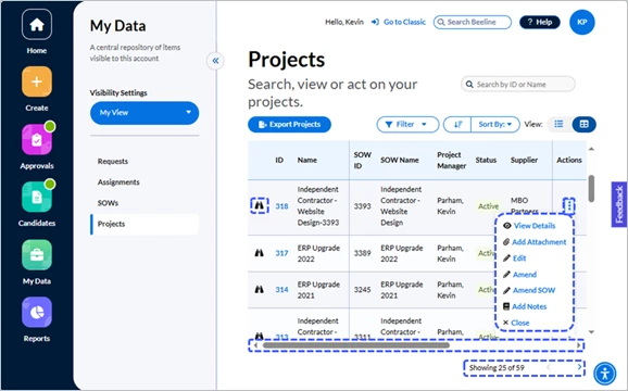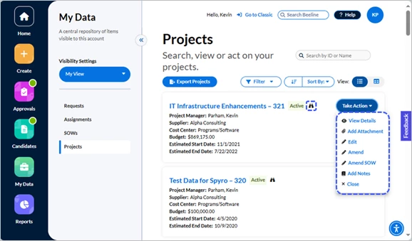 - Take Action – Click the button to reveal which action options are valid for that Project. The standard options are View Details, Add Attachment, Edit, Amend, Amend SOW, Add Notes, and Close.
