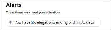 If you enter an End Date when you assign a delegate, Beeline Enterprise tracks that date and posts an Alert on your Home screen to let you know in advance when the delegation rights are about to expire. This reminder helps you keep your delegates “active” as needed.