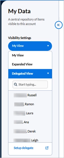 Click Delegated View in the Visibility Settings panel and the panel expands to list each Delegator by name—up to a total of six names. A search box displays above the list when you have more than six Delegators. Click any name in the list and your screen refreshes to display the records delegated to you by that Delegator for the category (Requests, Assignments, SOWs, Projects) you currently have open. Or use the search box to enter a name and change your records display to a different Delegator’s records. The system retains the Delegator’s name as the active filter even when you switch from one category to another within the My Data app. Navigate away from the My Data app and the system reverts to the default view (My View) or to the “favorite” view you previously selected.