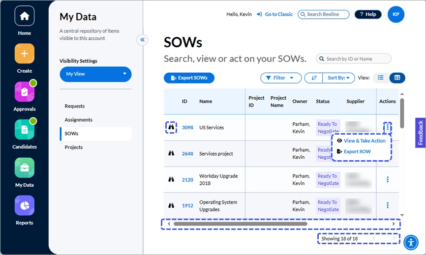 - Actions is now a locked column locked on the right side of the table layout. Click the kebab icon (⋮) to reveal which actions can be taken on any given row. Use the Export SOW option in this selection list to export an individual SOW (doc, docx, or PDF format) or use the Export SOWs button located above the table to download the list of SOWs in xlsx format.