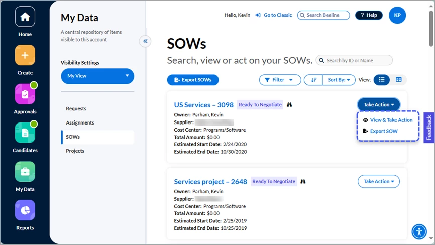 - Take Action – Click the button to reveal which action options are valid for the respective SOW. The standard options are View & Take Action and Export SOW.