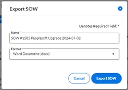 - Download SOW – Need a copy of a specific SOW document? Click the “Export Sow” option on the Take Action menu to retrieve a copy of the SOW document in either docx, doc, or pdf format.