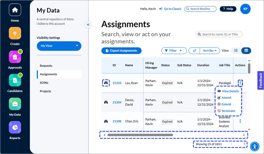 - Search by name, ID, or title – This search field filters your results to display active assignments only. Use the Search Beeline field at the top of the screen to make unfiltered searches that include closed records.