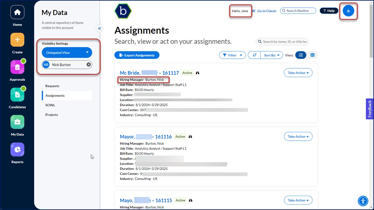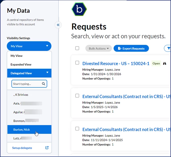 | Delegated View | Focus on requests, assignments, SOWs, and projects delegated to you by other users. This option gives you access to a list of all users who have delegated items to you. Learn more Use the Visibility icon to quickly understand why you’re seeing a specific piece of data. | When you select a user who has delegated data to you, the view of their data applies only as you navigate between data categories in the My Data app. It is not retained when you navigate away from the My Data app, when you use the Back to My Apps or Return buttons or when you log out and back in to your Hiring Manager Experience. | ![]() |