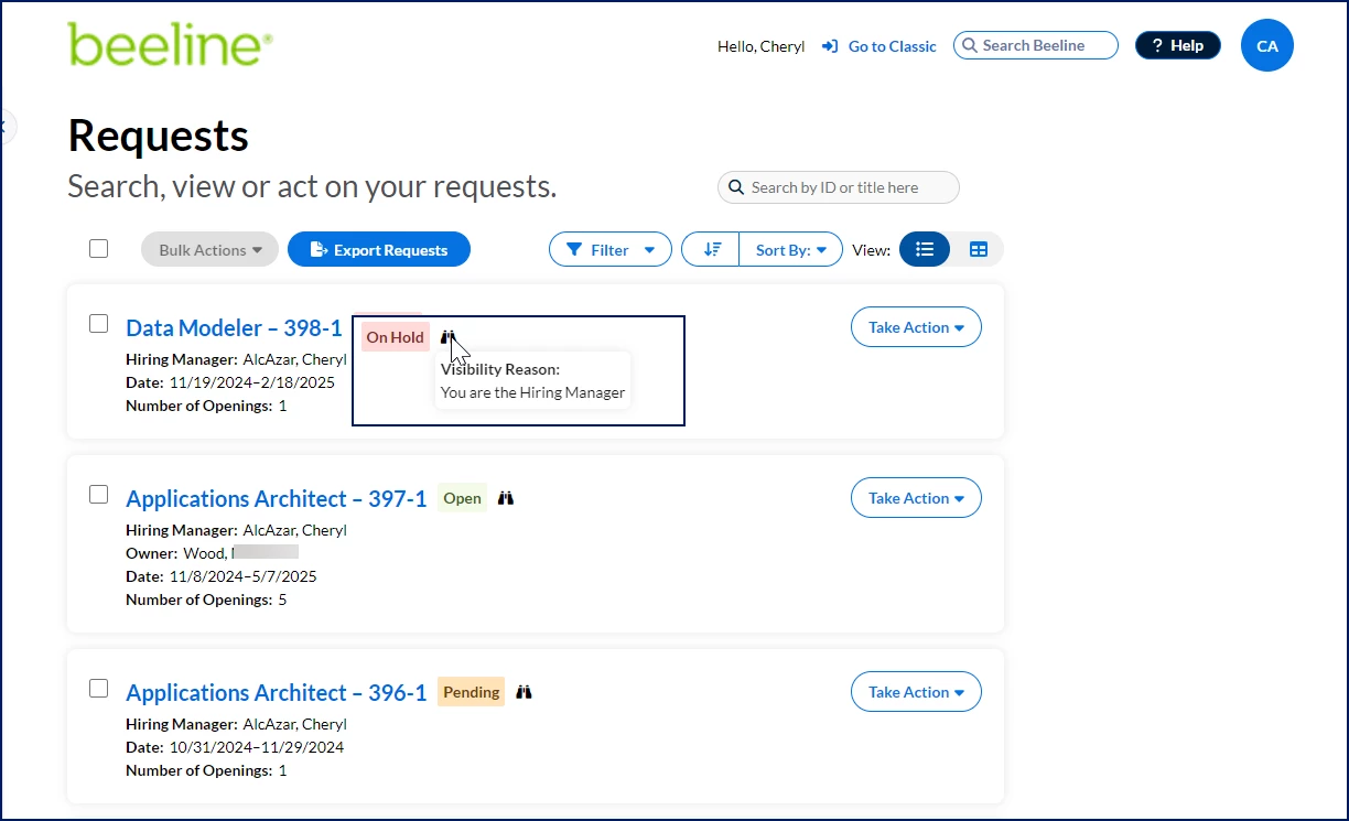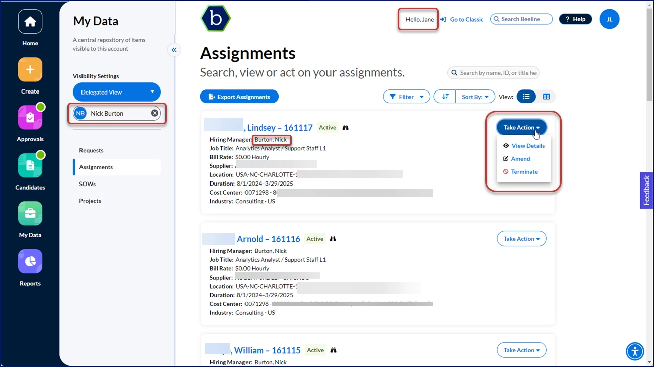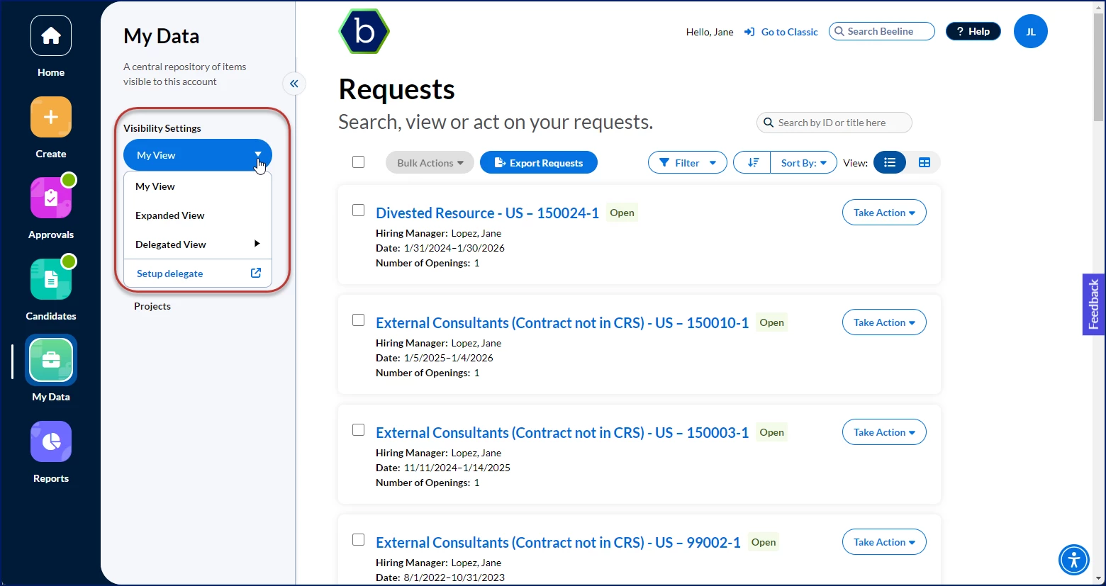 Alert: The Visibility option applies to actions a delegated user can perform from the My Data app in the Hiring Manager Experience only. It doesn’t extend to other apps in the Hiring Manager Experience nor to Beeline Classic.