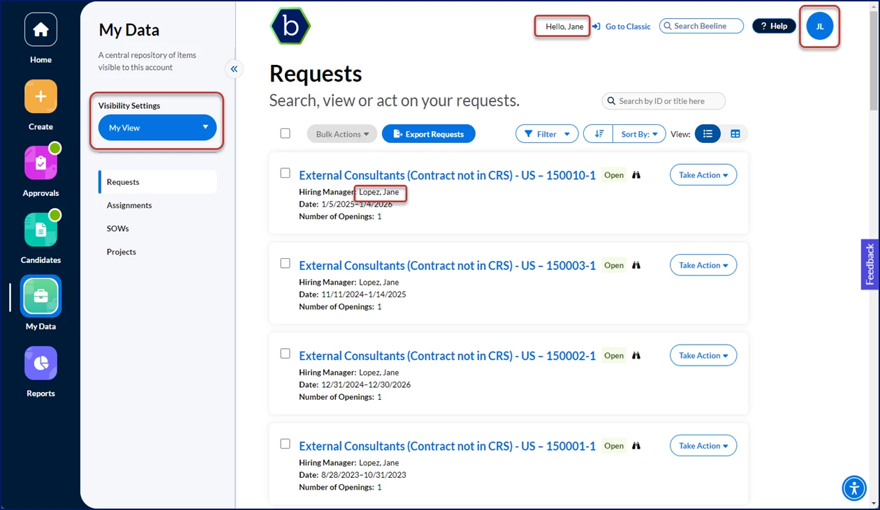 | My View | When you access the My Data app, My View is your default data view. It shows you requests, assignments, SOWs, and projects for which you’re the direct hiring manager, SOW owner or project manager. Data in this view belongs only to you. Use the Visibility icon to quickly understand why you’re seeing a specific piece of data. | Once you select My View from the Visibility Settings filter, it becomes your favorite or preferred view. Just like when you choose the Card and Table views as the way you like to view and work with data. My View is retained in these scenarios: