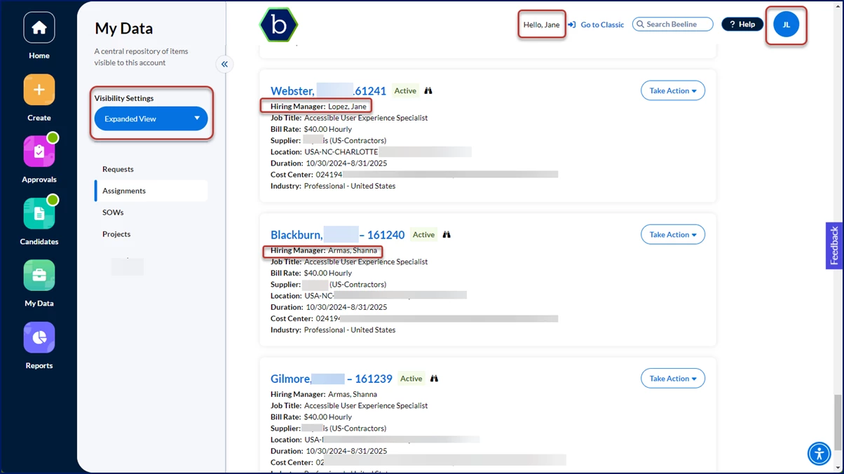 Not only can you see data for which you’re the direct hiring manager, SOW owner or project manager, you might also see data delegated to you, data assigned to your subordinates, and data for which you’re a requestor, a timesheet approver, a sponsor, or a contributor. Plus, you probably have multiple types of data related to different workflows, like requisitions, assignments, SOWs, and projects.