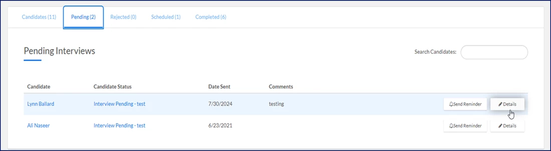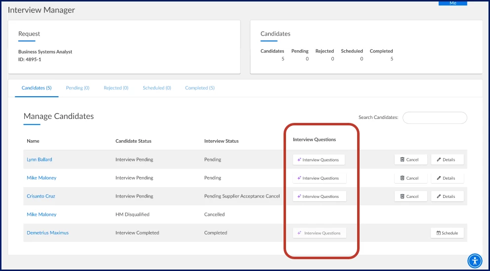 From the Action list, select ViewDetails. Interview Manager displays. TIP: The ManageCandidates tab displays by default showing only the interview request you selected. Select the Show All Candidates link in the upper-right corner to view all candidates submitted by your organization for a specific request.