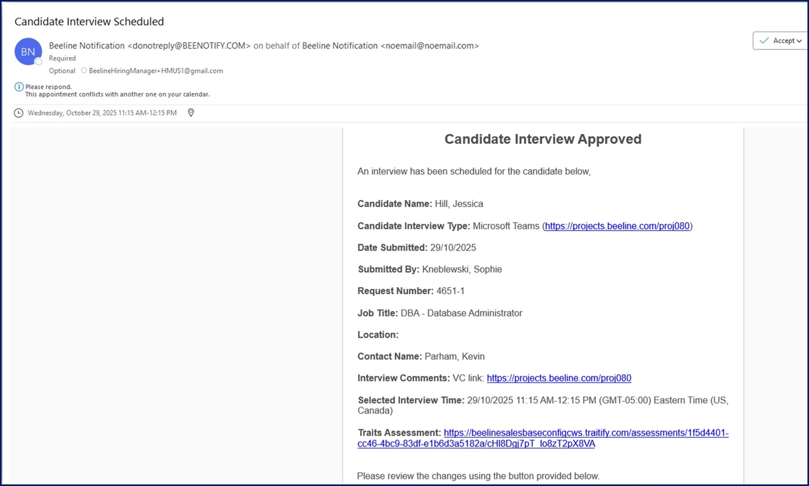 After you send an invite, an interview request is sent to the supplier. After the supplier confirms the interview, notifications are sent to the attendees with an .ics file attachment they can add to their calendar application. The notification also informs the attendee whether their attendance is required or optional.