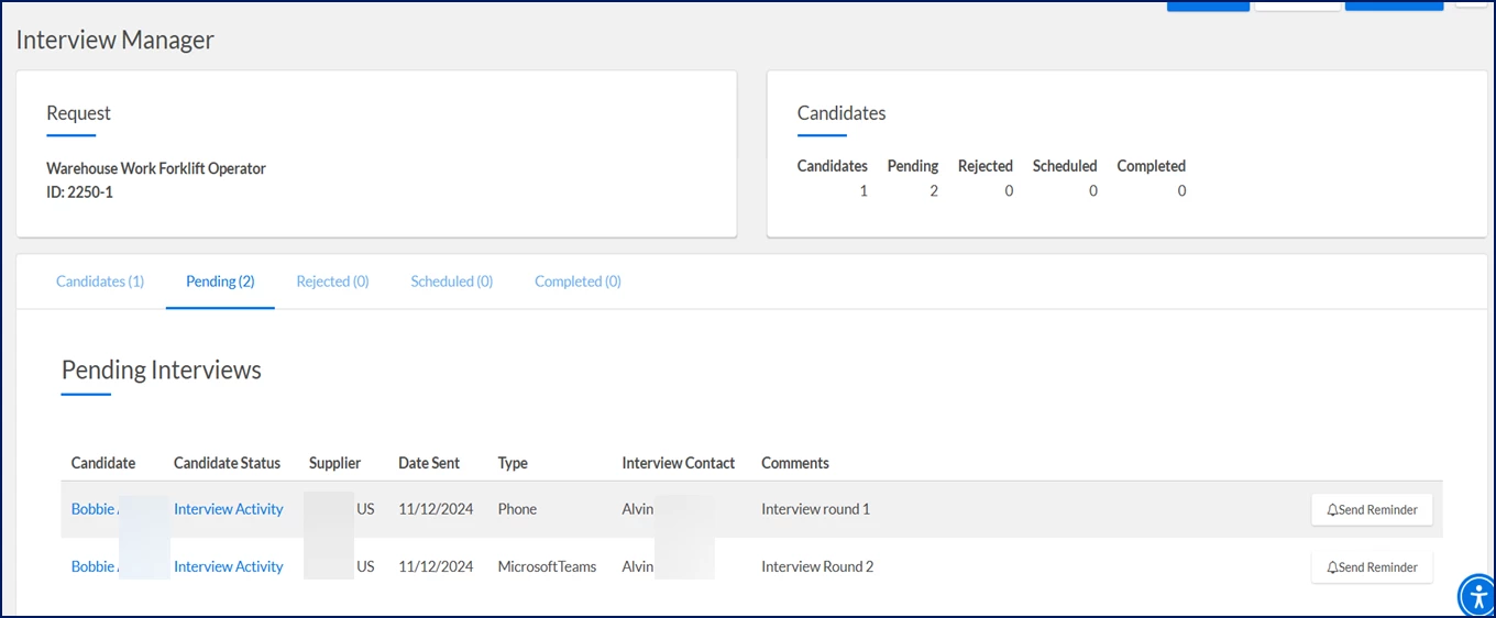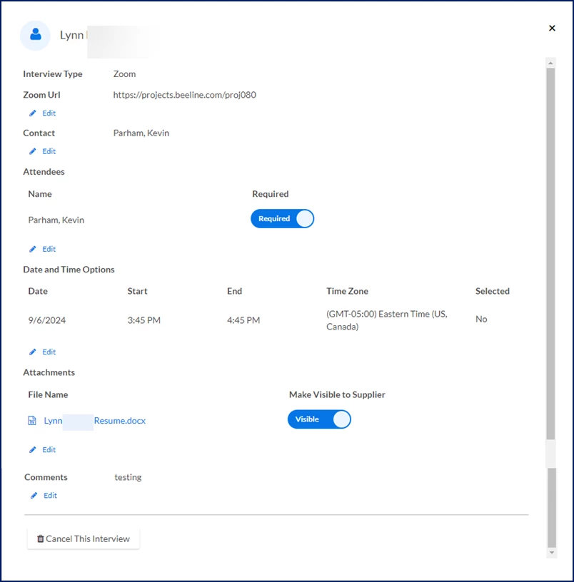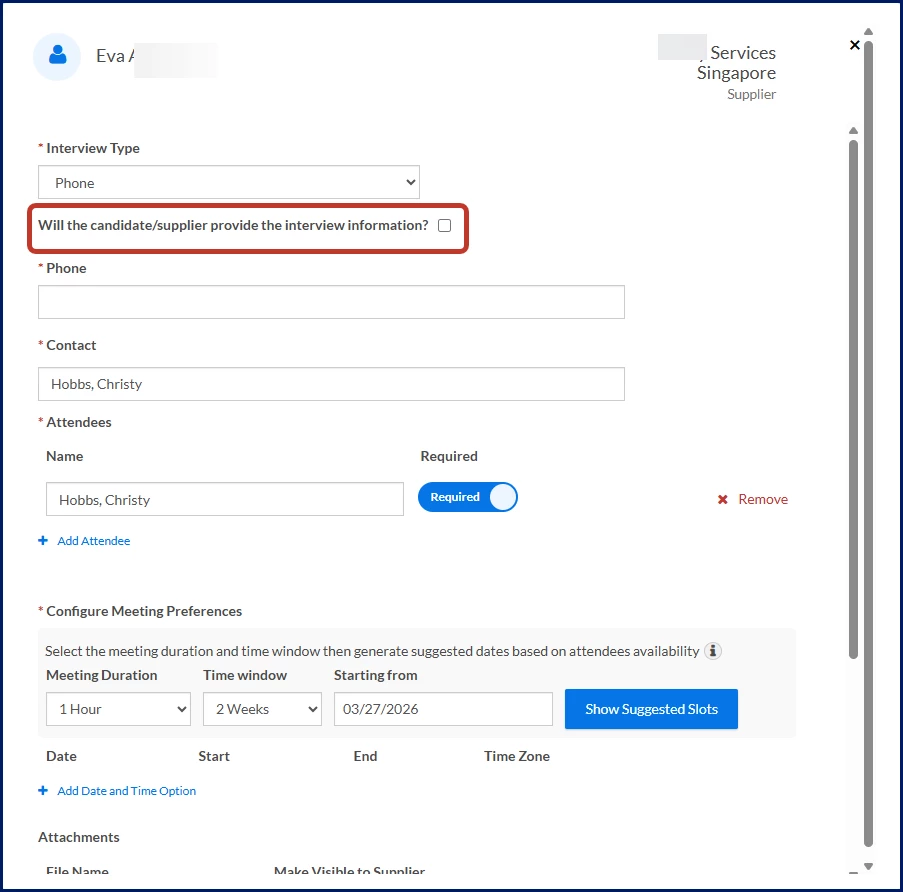 When scheduling an interview, you can choose whether the candidate or the supplier provides interview details. This flexibility allows you to adapt the process to your organization’s workflow.