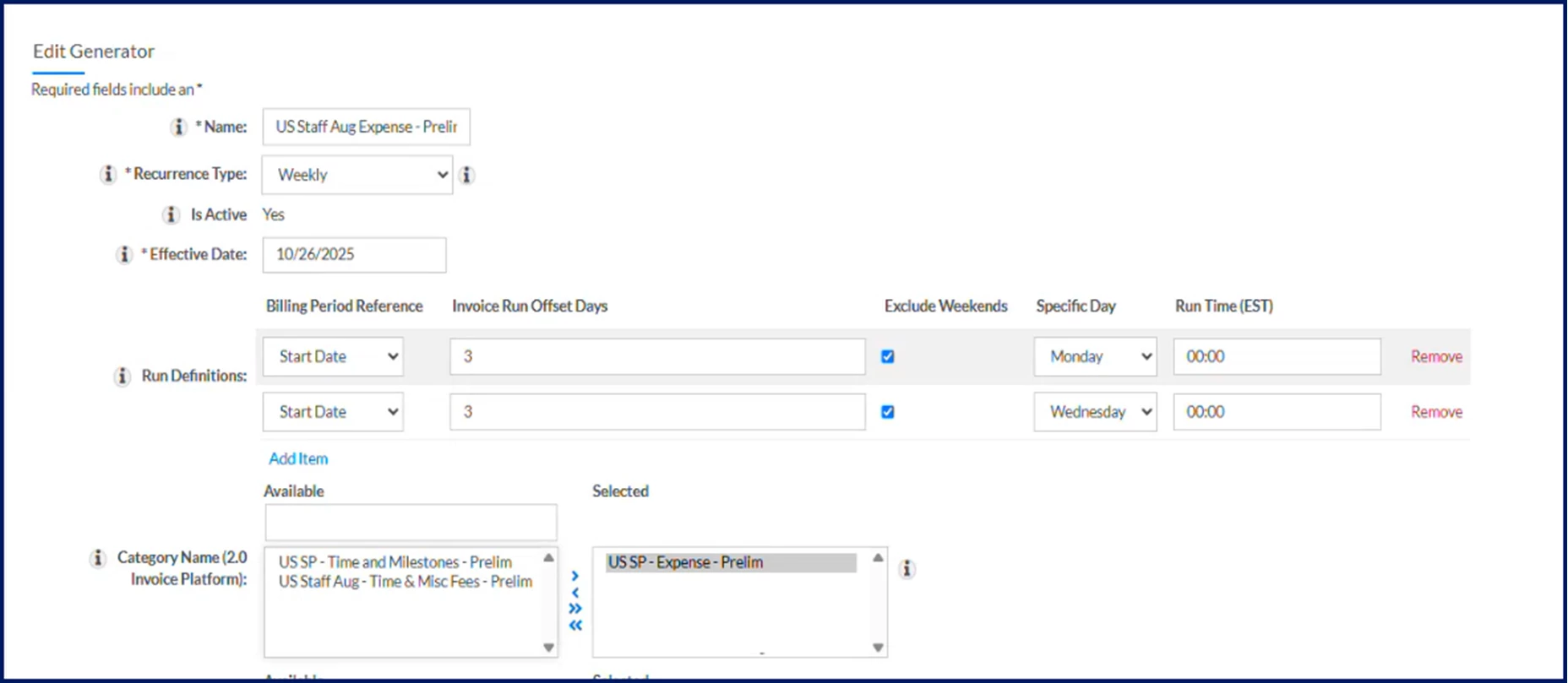 For example, you may want to run a preliminary invoice weekly on Mondays and Wednesdays. You’d create a single schedule with run definition details specified for each run time.