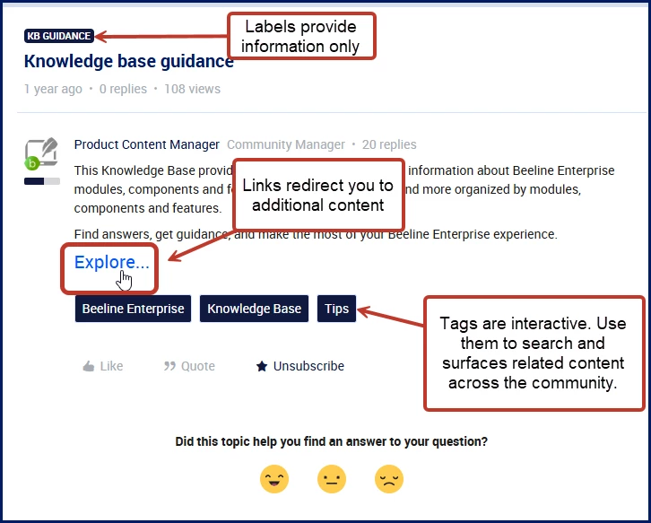 Articles and content in the Beeline Community incorporate visual clues to help you find and understand what you’re looking at. Browse through this topic to learn more.