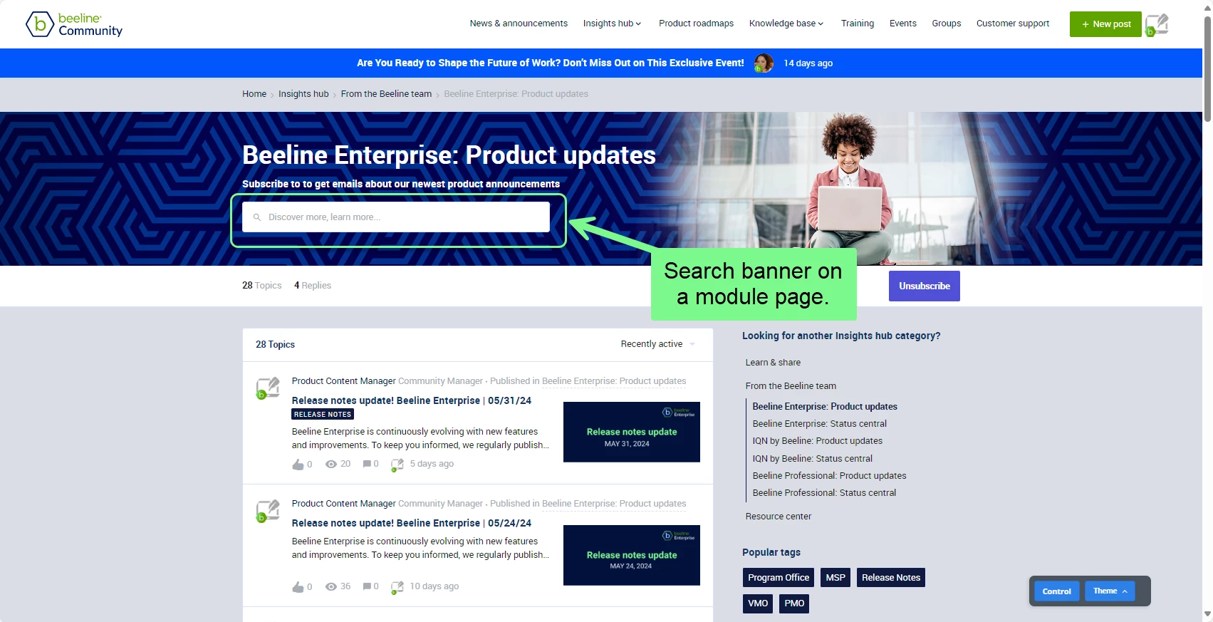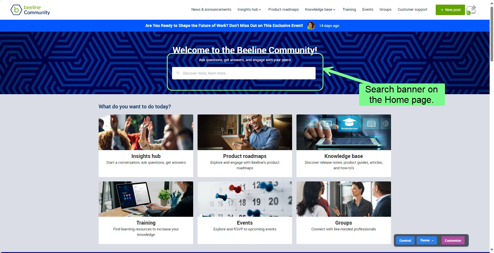 The Search banner displays on the Home page and when you drill down into a module in the community, such as the Insights hub or the Knowledge Base.