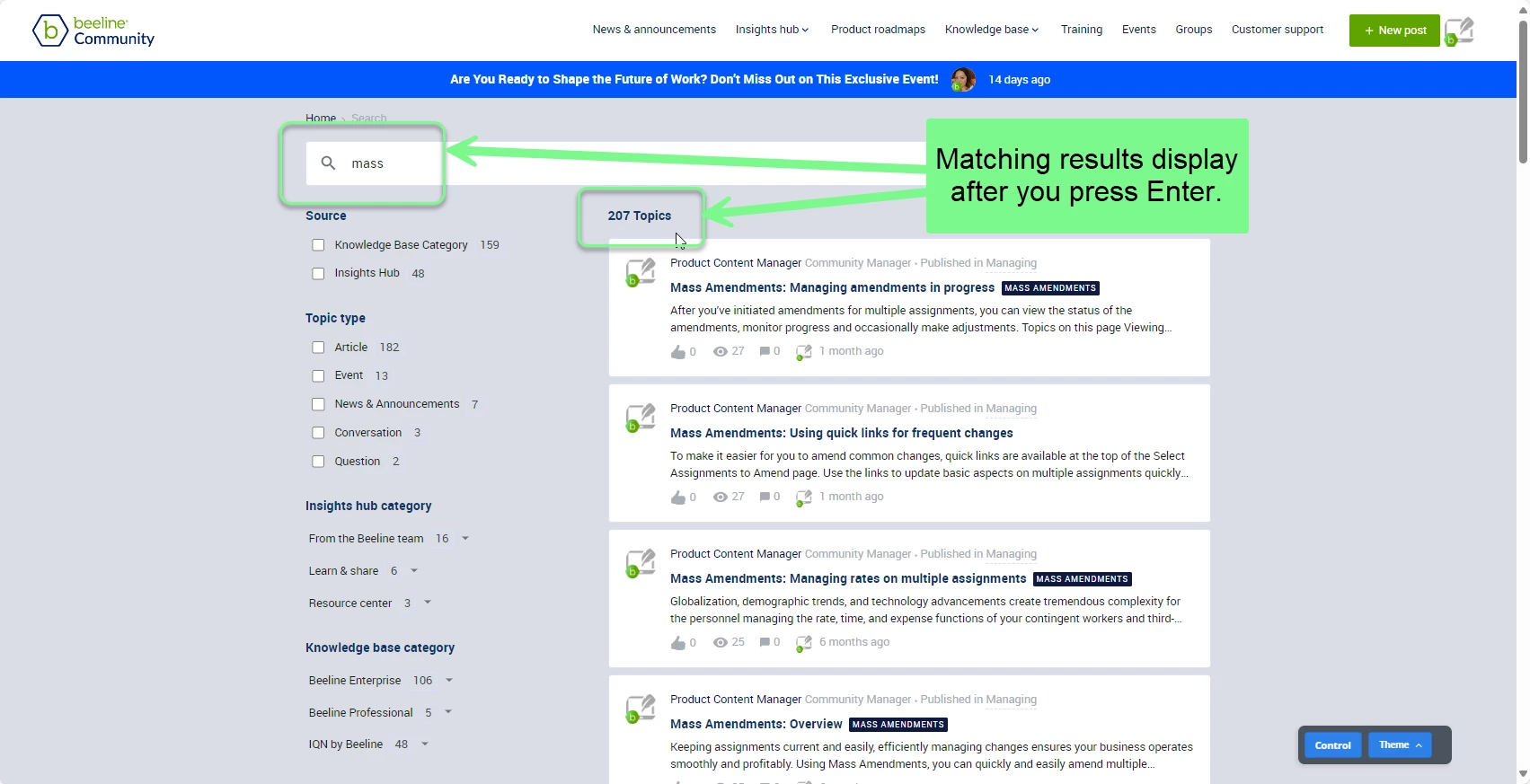 Your Beeline Community is loaded with information. When you first arrive, you might not know how to find exactly what you want. This article explains how Search works across the community and provides tips to help you locate the information you want quickly and successfully.