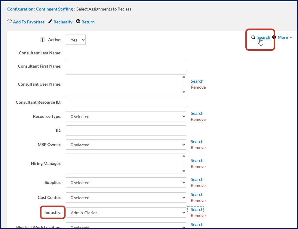 Pro tip: Use the Industry or Request Type lists with the Search icon near the top of the Select Assignments to Reclass page to instantly identify assignments that can be reclassified simultaneously.