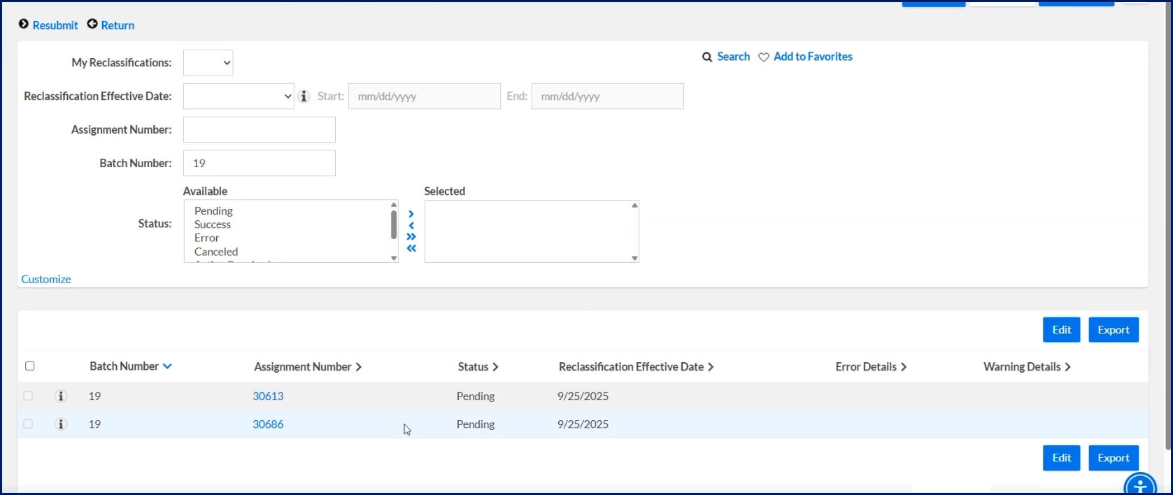 The Batch Number list to choose assignments in a specific status, such as Pending, Cancelled, and more.