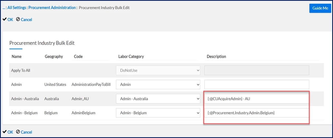 - After you’ve provided specifics for the details you want to modify, select OK to close the Procurement Industry Bulk Edit page and apply your changes.