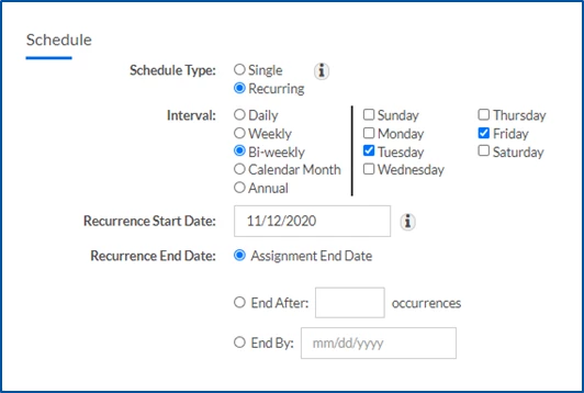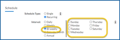 Optional. Some Interval options require you to define additional criteria. Select the additional criteria for the Interval option you selected. For example, when you select Bi‑weekly as your Interval option, you must select the day or days of the week that apply.