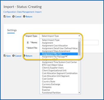 - From the Import Type list, select Assignment Misc Fee.