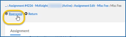 Select Return to close the MiscFee Reprocessing page and return to the assignment record.