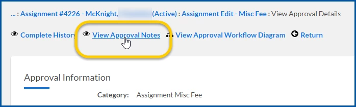 If you’ve chosen a fee in a Canceled, Processed, or Scheduled status, select ViewApprovalNotes. An ApprovalHistoryResults page displays showing you the results of each step in the approval workflow the fee is associated with.